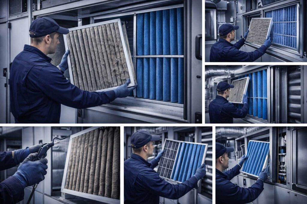 ZKT Kälte-Klima aus Leverkusen übernimmt die fachgerechte Filterreinigung und den Filteraustausch für gewerbliche Lüftungsanlagen.